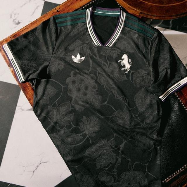 整套球衣以黑色短裤收尾,队徽、三叶草与球员号码点缀米白色细节,搭配深绿色三条纹。黑色球袜印有“Juventus”字样,完整呈现整体造型。