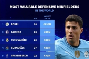 体育资讯4月6日讯 德国转会市场统计了防守型中场球员的身价,并列出榜单,罗德里1.3亿欧居首,凯塞多、琼阿梅尼、吉马良斯8000万欧并列第二。