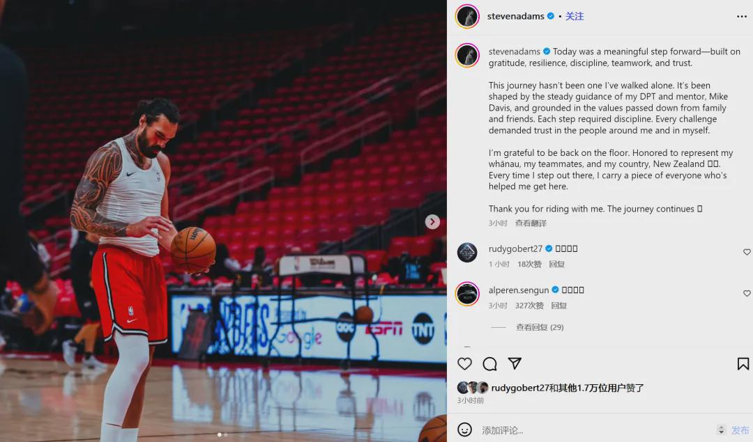 申京、戈贝尔等人现身评论区,给亚当斯送上祝福和鼓励。2023年10月,亚当斯接受十字韧带手术,赛季报销。2024年2月,亚当斯被灰熊送至火箭。亚当斯在火箭养伤大半年,球队耐心等他康复,2024年10月29日迎来火箭首秀。